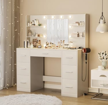 Furmax Vanity Desk with Mirror, LED Lights and Power Outlet Makeup Vanity Table with 7 Drawers and 6 Storage Shelves Dressing Table for Bedroom Dressing Room (White)